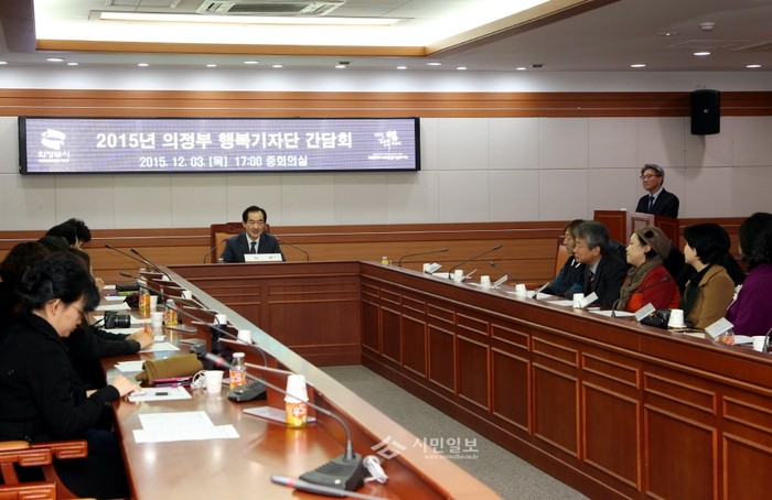 경기 의정부시 행복기자단은 지난 3일 오후 5시 시청 중회의실에서 간담회를 열고 2015년의 성과보고와 오는 2016년 운영방향에 대한 자유토론을 실시했다. 사진은 간담회에 참석한 관계자들이 안병용 의정부 시장과 대화하는 모습.(사진제공=의정부시청)