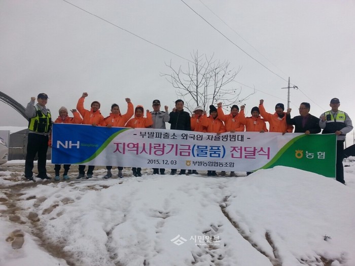 경기 이천경찰서는 지난 3일 부발파출소, 부발농협장, 생활안전협의회, 자율방범대등 경찰협력단체장이 참석한 가운데 외국인 자율방범대원들에게 겨울 점퍼를 전달했다. 사진은 전달식에 참석한 관계자들이 기념촬영을 하는 모습.(사진제공=이천경찰서)