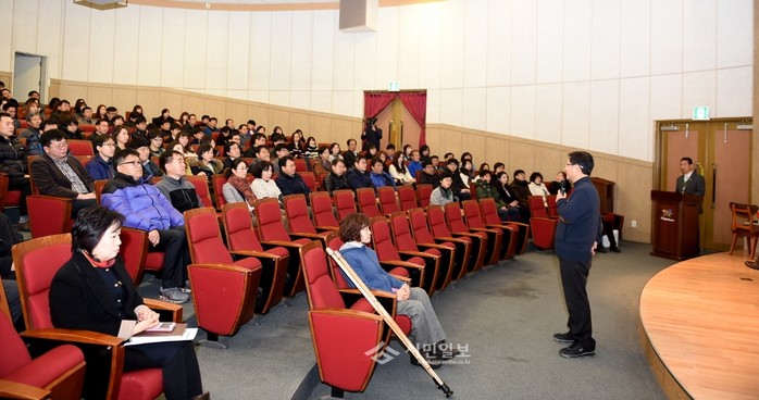 노원구는 지난 3일 오전 9시30분 구청 6층 소강당에서 '2015 장애인 인식개선 및 인권증진 교육'을 실시했다. 사진은 김성환 구청장이 장애인 인식개선 및 인권증진 교육에 앞서 인사말을 하는 모습.(사진제공=노원구청)
