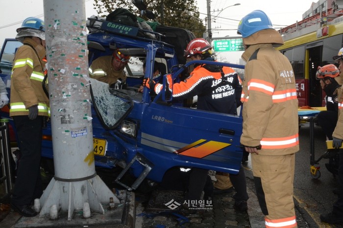 지난 3일 오후 서울 은평구 증산로 와산교 사거리 도로에서 트럭운전자가 교통표지판을 들이받는 사고가 발생했다. 사진은 사고현장에 출동안 은평소방서 119구조대원들이 운전석에 끼어있던 운전자를 구조하는 모습.(사진제공=은평소방서)
