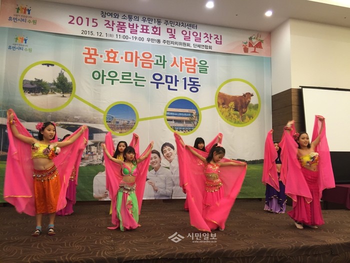 경기 수원시 팔달구 우만1동은 최근 수원노블레스컨벤션에서 '2015 주민자치센터 작품발표회 및 일일찻집'을 개최했다. 사진은 작품발표회에서 어린이들이 벨리댄스 공연을 진행하는 모습.(사진제공=팔달구청)