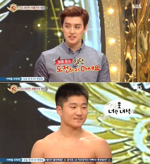 그는 과거 방송된 SBS '놀라운 대회 스타킹'(이하 '스타킹')에서 씨름 신동 이신 군과 씨름 대결을 펼쳤으나 바로 무릎을 꿇어 웃음을 자아냈다.