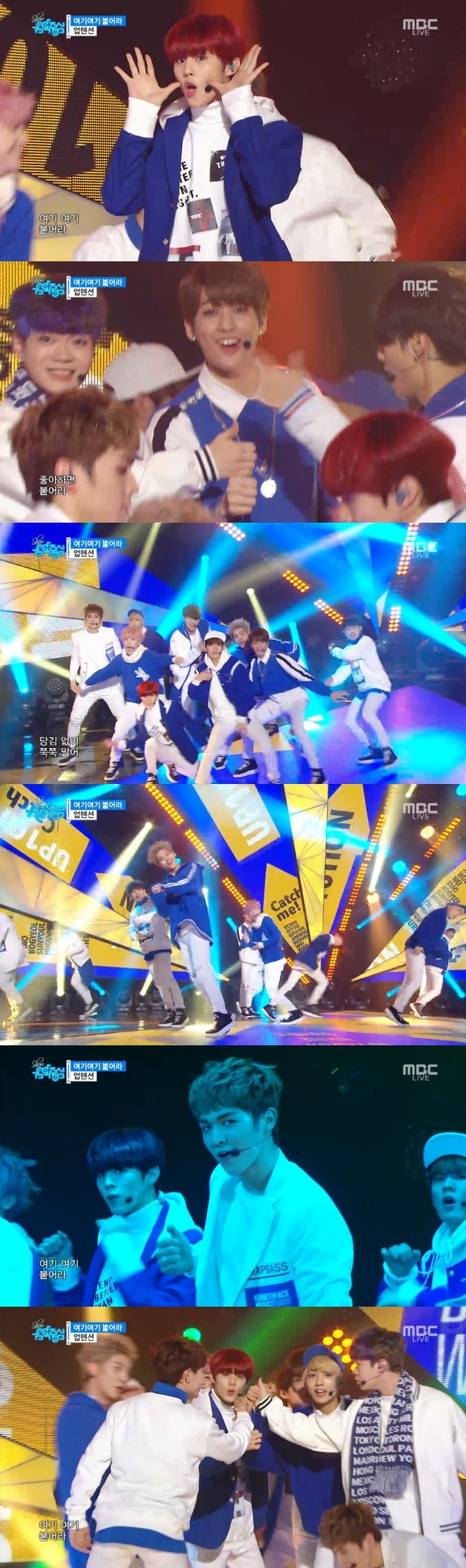 5일 방송된 MBC '쇼! 음악중심(이하 음악중심)'에는 업텐션이 출연해 두 번째 미니 앨범 'BRAVO!'(브라보!)의 타이틀곡 '여기여기 붙어라' 무대를 꾸미며 악동꾸러기들의 유쾌 발랄한 표정들로 무대를 장악했다.