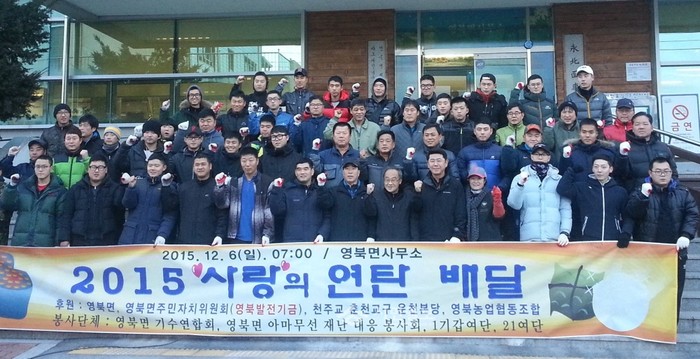 경기 포천시 영북면은 지난 6일 천주교 춘천교구 운천본당에서 저소득 가정에 연탄과 쌀을 전달하는 '사랑의 연탄 나눔' 행사를 진행했다. 사진은 행사에 참석한 관계자들이 기념촬영을 하는 모습.(사진제공=포천시청)