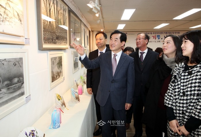 경기 의정부시 의정부1동 주민자치센터는 최근 3층 대회의실에서 '2015년 의정부1동 주민자치센터 작품 발표 및 전시회 기념식'을 진행했다. 사진은 행사에 참석한 안병용 시장과 관계자들이 작품을 감상하는 모습.(사진제공=의정부시청)