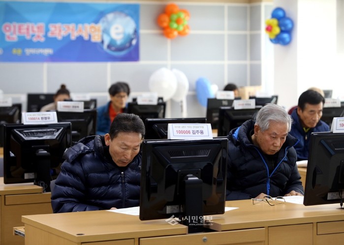 서울 금천구는 최근 구청 전산교육장에서 55세 이상 노인 40명을 대상으로 '2015 어르신 인터넷 과거시험'을 개최했다. 사진은 행사에 참석한 노인들이 인터넷으로 시험을 보는 모습.(사진제공=금천구청)