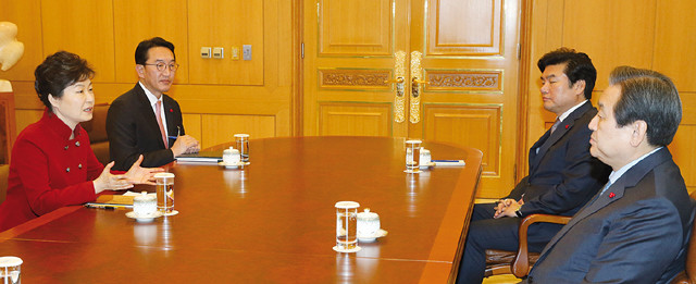 박근혜 대통령이 7일 오후 청와대에서 새누리당 김무성 대표, 원유철 원내대표와 회동하고 있다.
