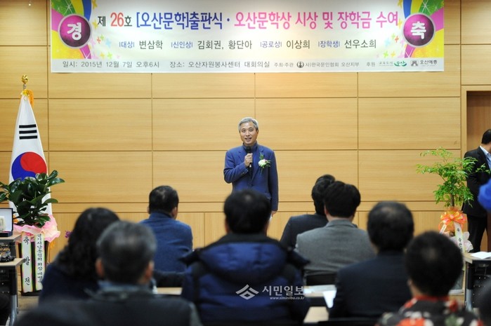 (사)한국문인협회 오산지부는 지난 7일 경기 오산자원봉사센터에서 '오산문학출판기념식 및 장학금 전달식'을 개최했다. 사진은 행사에 참석한 곽상욱 오산시장이 인사말을 하는 모습.(사진제공=오산시청)