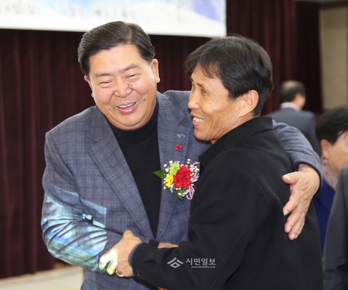 조길형 서울 영등포구청장(왼쪽)이 지난 6일 베누스웨딩홀에서 열린 '영등포육상연합회 송년의 밤'에 참석해 지역내 생활체육 활성화를 위해 애쓴 회원들을 격려하고 있다.(사진제공=영등포구청)