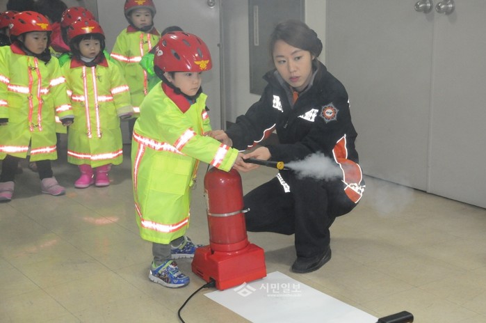 서대문소방서는 지난 7일 소방서에서 세나어린이집 어린이를 대상으로 '어린이안전교육'을 실시했다. 사진은 교육에 참석한 어린이가 소화기 사용 실습을 하는 모습.(사진제공=서대문소방서)