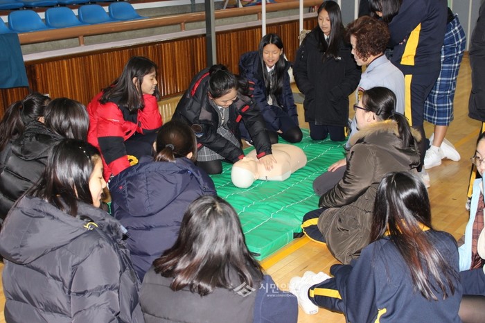 경기 이천소방서는 지난 7일 이천 양정여자중학교에서 2학년 학생 210명과 교직원을 대상으로 응급처치 요령에 대한 교육을 실시했다. 사진은 교육에 참석한 학생들이 심폐소생술 요령에 대해 배우는 모습.(사진제공=이천소방서)