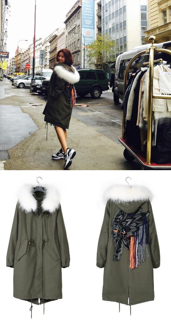뒷면의 유니크한 인디언 디테일로 여성들의 시선을 끌고 있는 야상 점퍼는 여성복 브랜드 시슬리(SISLEY) 제품으로 알려졌다.