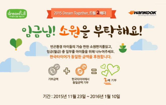 한국타이어는 2016년 1월 10일까지 실시되는 이번 캠페인 기간 동안 임직원 및 일반 참여자를 대상으로 총 1억 5천만원의 기부금을 모으고, 이에 동일한 액수를 기부해 3억 원의 기부금을 조성하는 것을 목표로 삼았다. 또한 올해에는 매칭그랜트 기부와 함께 한국타이어 임직원들의 임금(급여) 중 일부를 기부하고, 참여자가 100명에 이를 때 마다 한국타이어가 1천만원씩 기부하여 5천만원의 기부금을 추가적으로 모을 예정이다. 이렇게 조성된 총 3억 5천만원은 소외계층 아동들의 꿈을 실현시키는 데 사용될 계획이다.