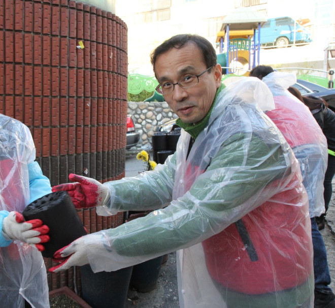 김영국 대전지방고용노동청장이 지난 8일 KT CS 노사정이 함께하는 ‘행복한 겨울나기’ 봉사활동에 참여해 연탄배달 봉사활동을 하고 있다.(사진제공=KT)