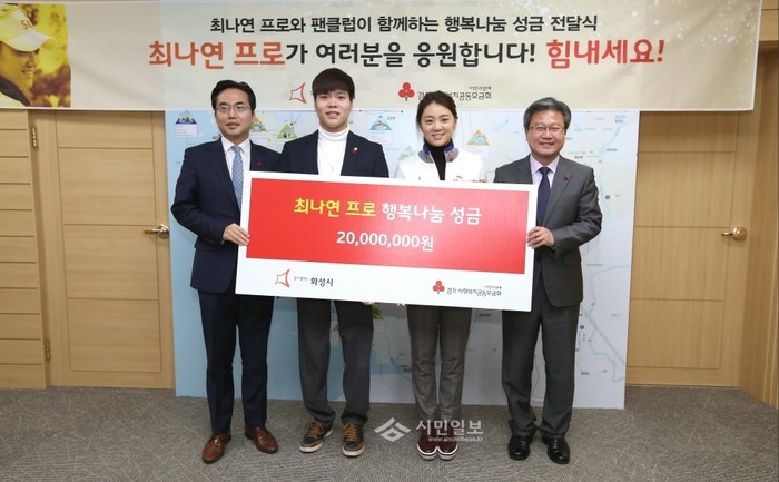 지난 8일 LPGA 최나연 프로(SK텔레콤)는 경기 화성시청을 방문해 채인석 시장과 김세진 화성시 체육회 수영선수를 만나 후원금 2000만원을 기부했다. 사진은 오른쪽부터 채 시장, 최 프로, 김 선수의 모습.(사진제공=화성시청)