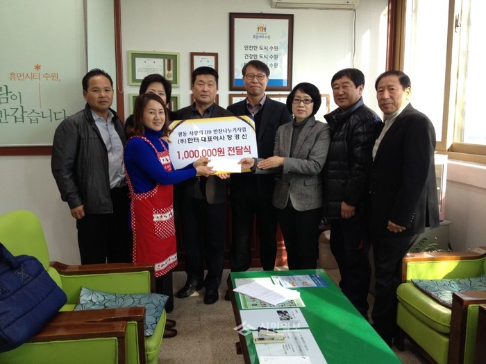 경기 수원시 권선구 평동은 9일 '사랑의 119 반찬나누기 지원금 전달식'을 진행했다. 사진은 지원금 100만원을 전달한 (주)한터 장경신 대표이사와 관계자들이 기념촬영을 진행하는 모습.(사진제공=권선구청)