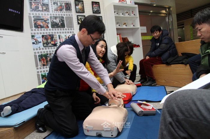 서울 동작소방서는 지난 9일 오후 2시 소방서 2층 소회의실에서 소방산업체 대표자 20여명을 대상으로 간담회 및 안전교육을 실시했다. 사진은 교육에 참석한 관계자들이 심폐소생술 요령을 배우는 모습.(사진제공=동작소방서)