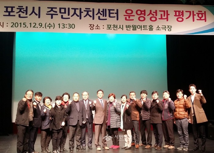 경기 포천시는 지난 9일 반월아트홀 소극장에서 주민자치센터 운영성과 평가회를 개최했다. 사진은 행사에 참석한 관계자들이 평가회가 끝난 후 기념촬영을 진행하는 모습.(사진제공=포천시청)
