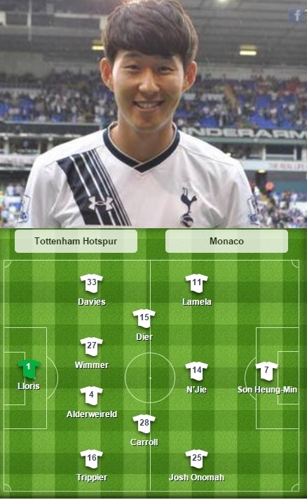 토트넘은 모나코와의 대결에서 손흥민을 최전방 공격수로 내세울 전망이다. 그를 이어 클린턴 은지와 델레 알리, 앤드로스 타운센트가 뒤를 받쳐줄 것으로 보인다.