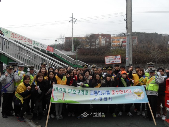경기 구리경찰서는 지난 10일 오전 교문동에 위치한 도림초등학교 스쿨존에서 '어린이 교통안전 캠페인'을 실시했다. 사진은 이날 캠페인에 참석한 관계자들이 기념촬영을 하는 모습.(사진제공=구리경찰서)