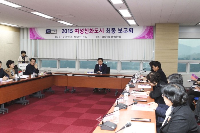 경기 용인시는 최근 정찬민 시장(가운데)을 비롯해 간부 및 여성친화도시 조성협의체 위원 등이 참석한 가운데 ‘2015 여성친화도시 최종 보고회’를 개최했다. 사진은 이날 참석한 관계자들이 회의를 진행 중인 모습.(사진제공=용인시청)