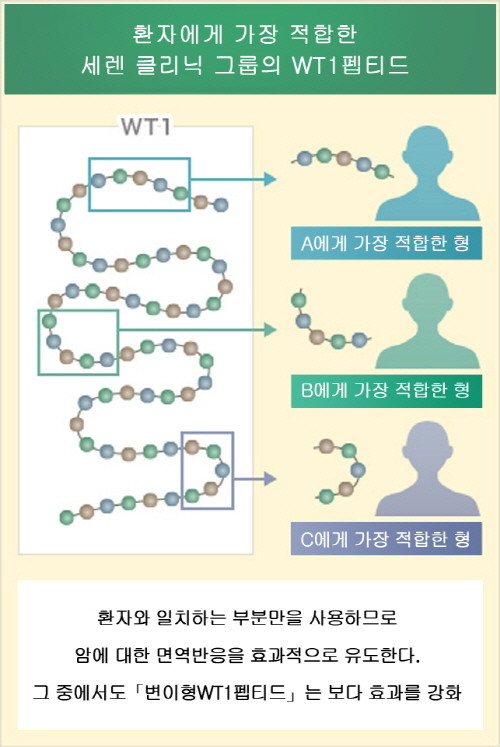 셋째, 사전 검사를 통한 개별화 의료로 진행한다. ‘박셀R’은 사전에 다양한 유전자 검사를 실시해 WT1펩티드를 사용할 때 암 환자와 일치하는 부분만의 펩티드를 추적해 사용함으로써 유용성을 높이고 있다. 또한 이 제작 방식은 세렌클리닉 그룹만 사용할 수 있는 독점 사용권을 가지고 있다.