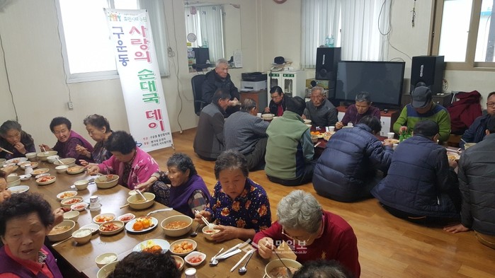 경기 수원시 권선구 구운동은 최근 지역내 상구운 경로당에서 통장협의회 주관으로 경로당 회원과 마을 노인 70여명을 초대해 ‘순댓국 데이’ 음식 나눔 봉사활동을 실시했다. 사진은 행사에 참석한 노인들이 식사를 하는 모습.(사진제공=권선구청)