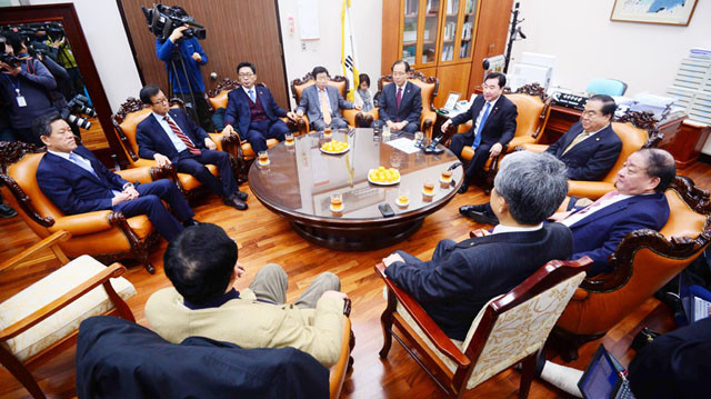 11일 서울 여의도 국회 부의장실에서 새정치민주연합 중진 의원들이 당 지도체제 변경 문제 등을 논의하기 위한 긴급간담회를 하고 있다. 이날 간담회에는 이석현, 주승용, 김동철, 김성곤, 강창일, 문희상, 유인태, 설훈, 양승조, 원혜영, 김춘진, 오제세, 최규성 의원이 참석했다.