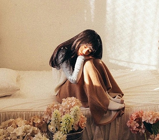 사진 속 신세휘는 꽃으로 둘러싸인 침대위에 앉아 생각에 잠긴 듯 몸을 웅크리고 있다.