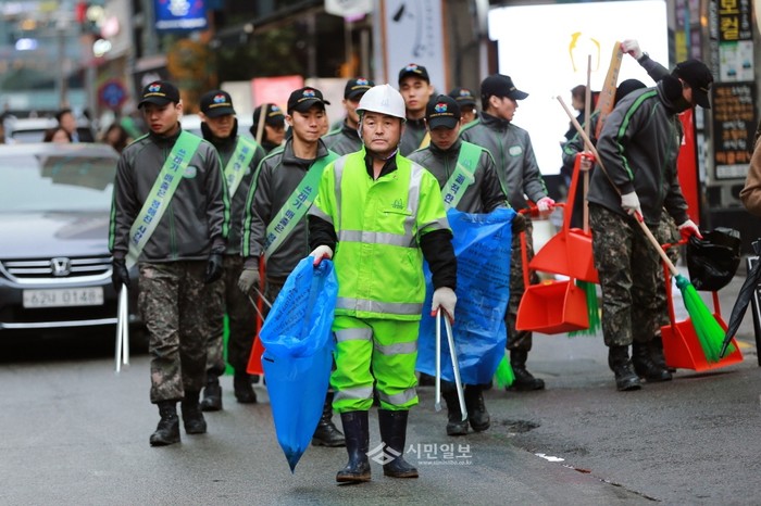 서울 서초구는 최근 강남역에서 민·관·군이 모두 함께 참여하는 '지구를 살리는 쓰레기 다 함께 줄이기' 캠페인을 실시했다. 사진은 캠페인에 참석한 관계자들이 쓰레기 수거를 하는 모습.(사진제공=서초구청)