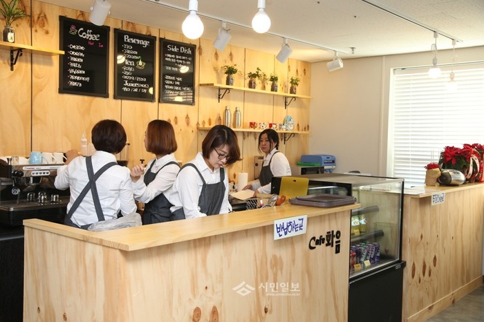 최근 마포구 상암동 월드컵파크10단지 아파트내 조성된 여성건강카페 '화음' 개소식이 열렸다. 사진은 카페 운영 회원들이 손님맞이 준비를 하고 있는 모습.(사진제공=마포구청)
