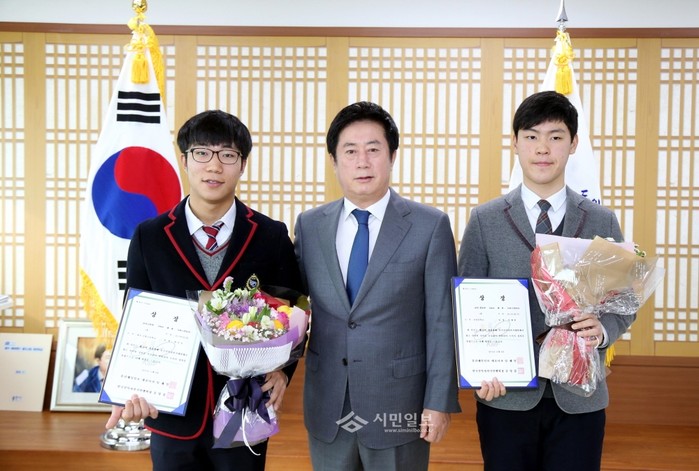 정찬민 경기 용인시장은 15일 시장실에서 지난달 경남 울산에서 열린 ‘제16회 대통령배 전국 산악자전거대회’에서 크로스컨트리 중등부 우승을 차지한 엄세범(보라중 2학년) 선수와 고등부 우승을 차지한 박우진(신봉고 2학년) 선수를 격려했다.(사진제공=용인시청)