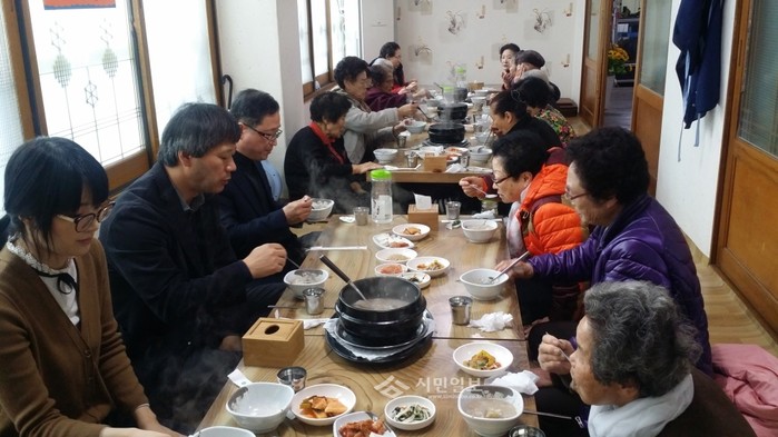 경기 동두천시 중앙동 주민센터는 지난 14일 낮 12시 생연2동에 위치한 '답십리 한방약오리' 식당에서 홀몸노인 15명을 위한 '사랑의 중식 봉사'를 실시했다. 사진은 행사에 참석한 관계자들이 식사를 하는 모습.(사진제공=동두천시청)