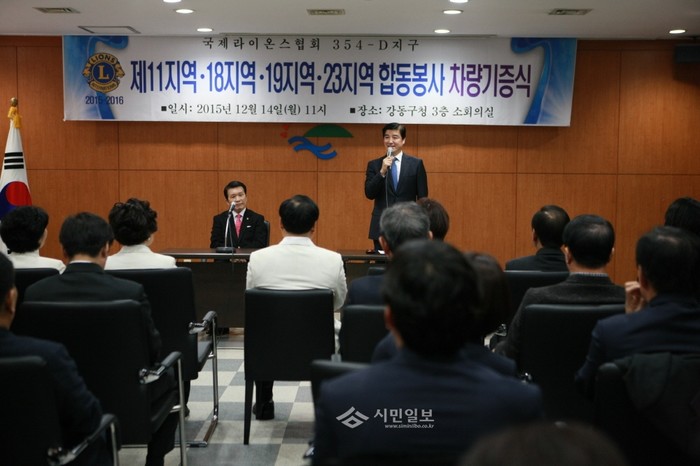 이해식 강동구청장은 지난 14일 오전 11시 구청장 집무실에서 '국제 라이온스 클럽 차량 기증식'을 개최했다. 사진은 기증식에서 이 구청장이 인사말을 하는 모습.(사진제공=강동구청)
