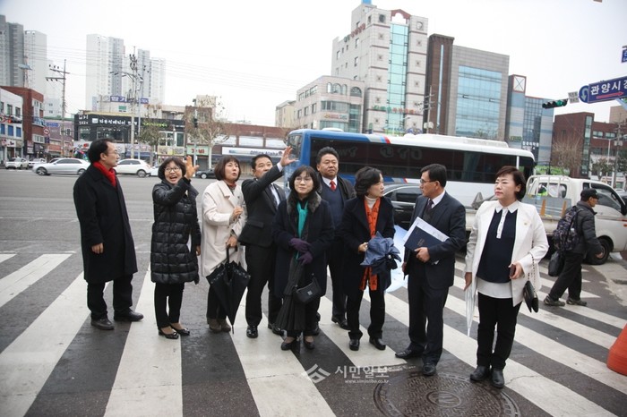 | ▲ 지난 14일 경기 안양시 관양시장 조형물 건립 현장을 방문한 안양시의회 예결특위 위원들이 대화를 나누고 있다.(사진제공=안양시의회) | ||