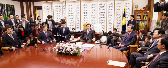 정의화 국회의장과 새누리당 김무성, 새정치민주연합 문재인 여야 대표가 15일 서울 여의도 국회 의장실에서 20대 총선 선거구 획정 문제 논의를 하고 있다.