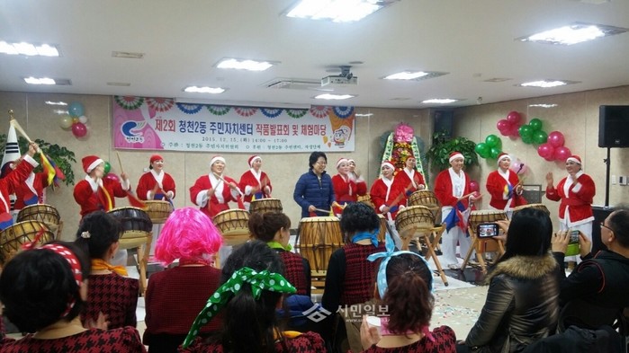 인천 부평구 청천2동 주민자치위원회는 지난 15일 오후 주민자치센터에서 '작품발표 및 전시회'를 진행했다. 사진은 행사에 참석한 홍미영 구청장(가운데)과 관계자들이 난타 공연을 하는 모습.(사진제공=부평구청)