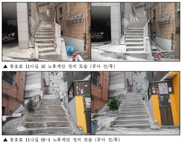 사업구간은 주민 생활에 밀접한 골목길 계단으로 ▲동로호 11아길 16 ▲동호로 11나길 69-1 ▲다산로 67-3 ▲동호로 8나길 41-6 등 남산자락내 노후된 계단 11곳이다.