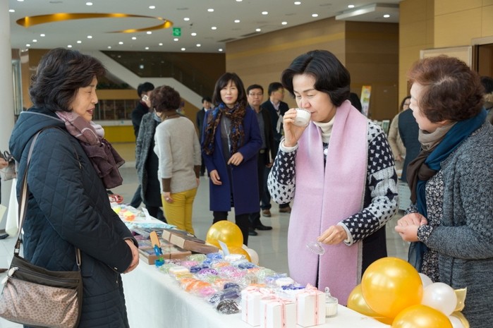김수영 양천구청장(오른쪽에서 두 번째)이 최근 해누리타운 아트홀에서 열린 '2015 마을공동체 성과발표 페스티벌'에 참석해 행사장 로비에 전시된 향초를 시향해보고 있다.(사진제공=양천구청)