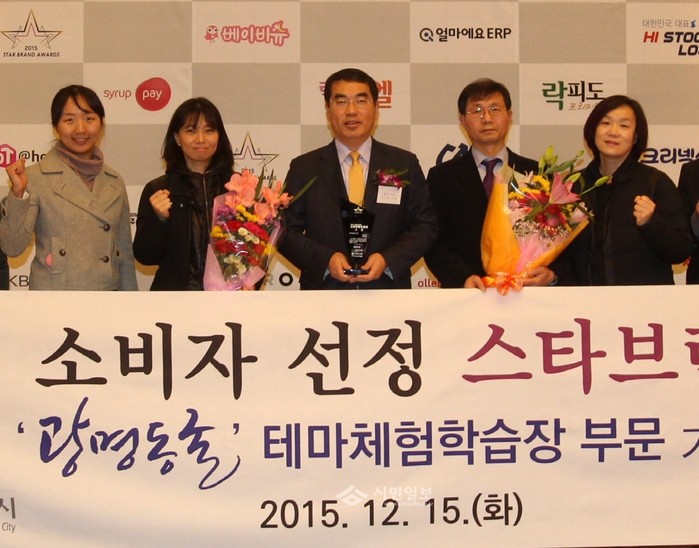 경기 광명시 광명동굴이 지난 15일 서울 밀레니엄 힐튼호텔에서 열린 '2015 소비자선정 스타브랜드 대상'에서 테마체험학습장 부문 대상을 받았다. 사진은 시상식에 참석한 양기대 시장(가운데)이 기념촬영을 하는 모습.(사진제공=광명시청)