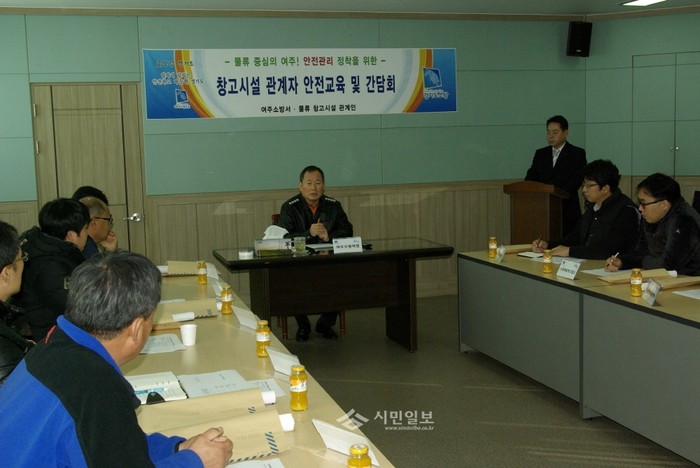 경기 여주소방서는 16일 본서 2층 소회의실에서 지역내 대형물류창고시설 관계자 20여명이 참석한 가운데 간담회를 개최했다. 사진은 간담회에 참석한 김오년 서장과 관계자들이 대화를 나누는 모습.(사진제공=여주소방서)