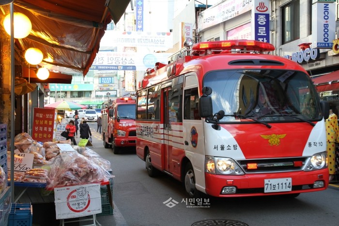 서울 동작소방서는 지난 16일 오후 2시 사당동 남성시장에서 '구청 유관기관 합동소방차 진입도로 확보훈련'을 실시했다. 사진은 진입훈련이 진행 중인 모습.(사진제공=동작소방서)