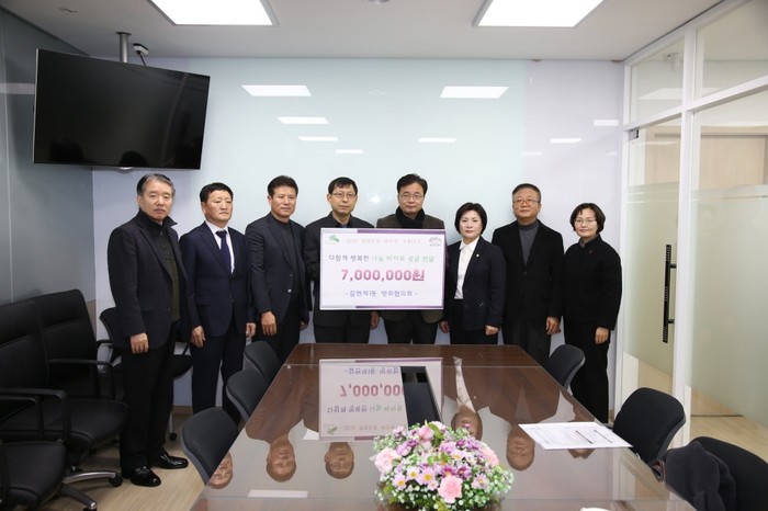 서울 은평구 갈현제1동 방위협의회는 지난 15일 은평구청에 '갈곡리 다함께 행복한 나눔 일일 바자회' 수익금 700만원을 전달했다. 사진은 전달식에 참석한 김우영 구청장(오른쪽에서 네 번째)과 관계자들의 모습.(사진제공=은평구청)