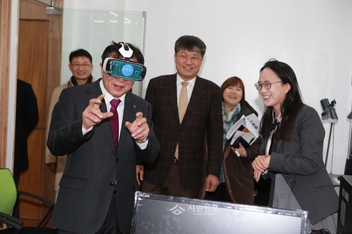 서울 금천구는 지난 16일 오후 2시 옛 시흥2동 주민센터에서 '무한상상 스페이스 개소식'을 개최했다. 사진은 행사에 참석한 차성수 구청장이 휴대전화를 이용한 가상현실 체험을 하고 있는 모습.(사진제공=금천구청)