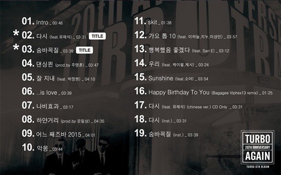 특히 터보의 첫 번째 타이틀 곡 ‘다시’의 피처링에는 국민 MC 유재석이 참여했으며 5번째 수록곡 ‘잘 지내’에는 박정현, 14번째 수록곡 ‘우리’에는 케이윌과 제시가 피처링에 합세해 터보의 새 앨범을 향한 남다른 애정과 친분을 드러냈다.