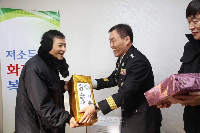 관악소방서는 지난 17일 오전 10시 저소득가정 화재피해복구 완료에 따른 입주식을 진행했다. 사진은 황인환 서장이 주민에게 소화기를 전달하는 모습.(사진제공=관악소방서)