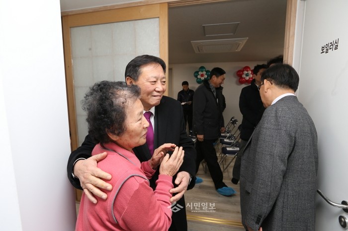 금천구는 지난 17일 시흥3동 보린두레주택에서 저소득 홀몸노인 10명의 입주를 축하하기 위한 입주식을 개최했다. 사진은 행사에 참석한 차 구청장이 보린두레주택 입주 노인을 행사장으로 안내하는 모습.(사진제공=금천구청)