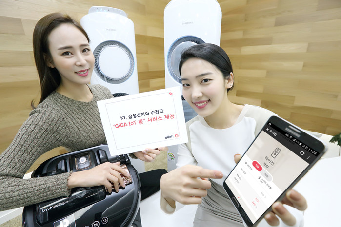 20일 KT에 따르면 이번 협력 사업을 통해 삼성전자는 스마트 가전의 제어·연동 기술을 지원하고, KT는 이 기술을 활용한 기가 IoT 홈 서비스를 제공한다. 이를 위해 양사가 보유한 플랫폼(KT의 기가 IoT 홈 플랫폼, 삼성전자의 가전 서버)을 연동, 이용자의 가정 내 와이파이(WiFi) 연결로 공유기(AP)를 통한 호환이 가능하도록 개발을 완료했다.