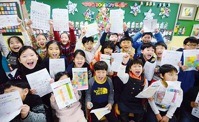 18일 서울 동작구 강남초등학교에서 겨울방학을 맞은 2학년5반 학생들이 겨울방학 계획표를 들어보이고 있다.