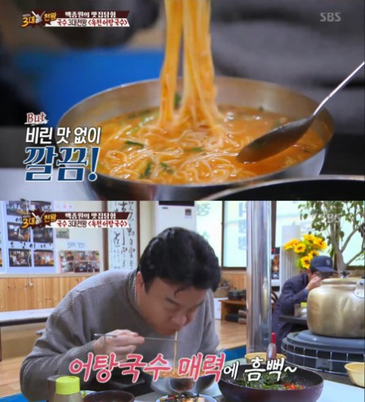 18일 오후 방송된 SBS '백종원의 3대천왕'에서는 백종원이 담양 멸치국수, 옥천 어탕국수, 제주 고기국수 '맛 3대 천왕 집'을 방문하는 장면이 그려졌다.